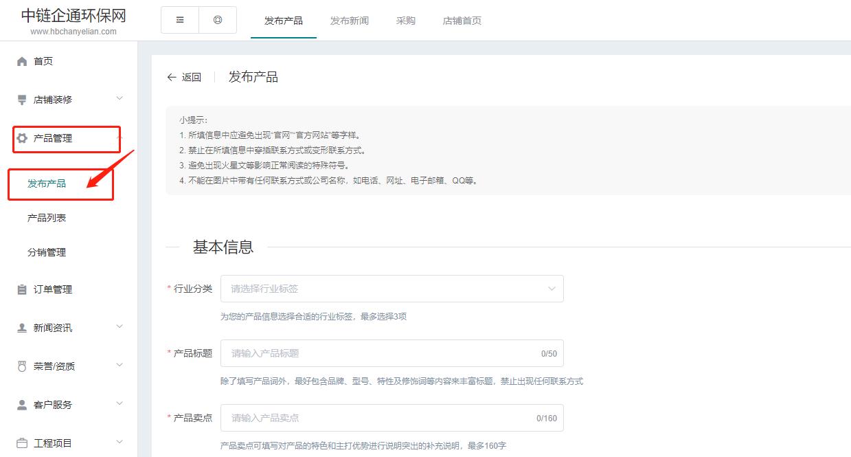 第一步:点击左侧“产品管理”里面的“发布产品”
